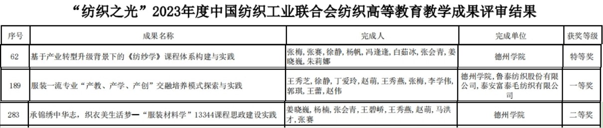 近日,中国纺织服装教育学会公布了《“纺织之光”2023年度中国纺织工业联合会纺织高等教育教学成果奖》获奖名单。纺织服装学院张梅教授主持的项目获得特等奖,王秀芝教授、姜晓巍副教授主持的项目分别获得一等奖和二等奖。