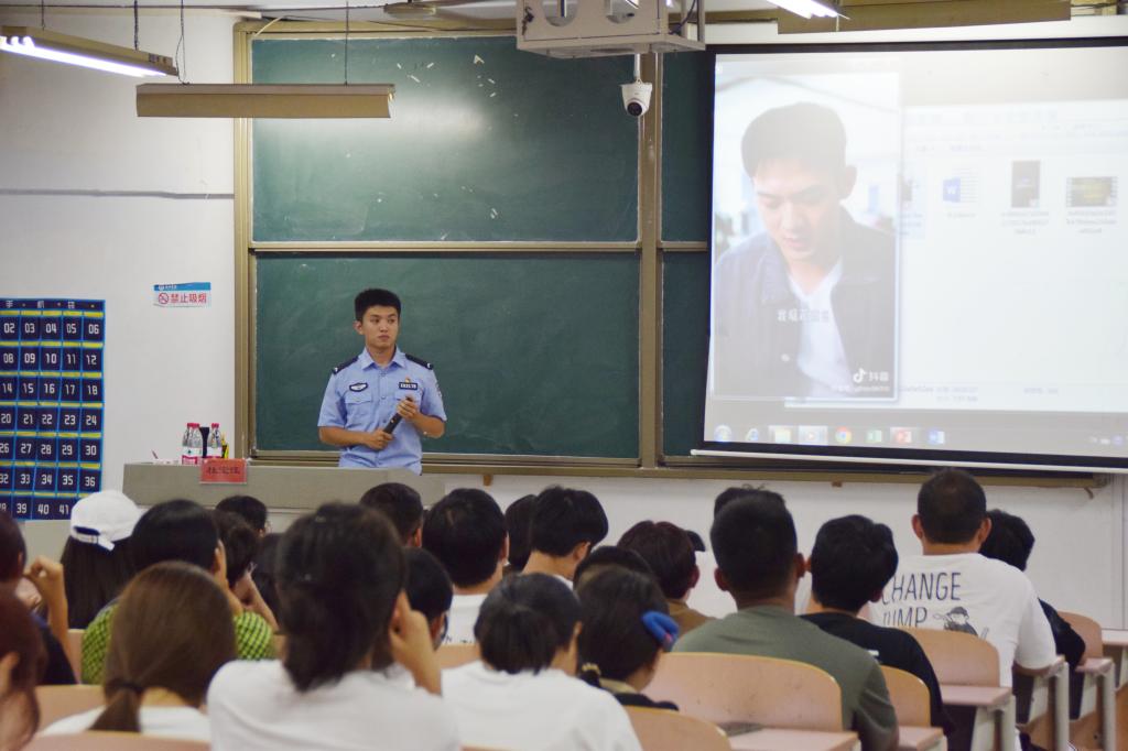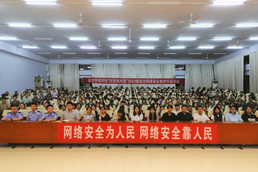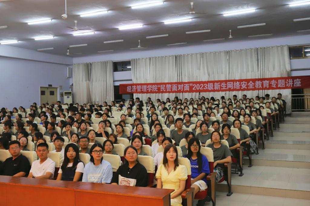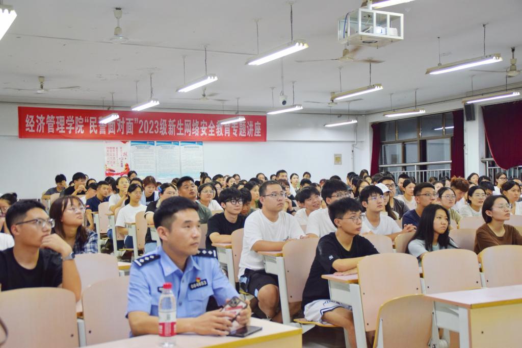 9月11日-9月17日是国家网络安全宣传周,今年的主题是“网络安全为人民 网络安全靠人民”。为提高学生的网络安全意识,筑牢高校网络安全屏障,9月13日晚,经济管理学院邀请驻地湖滨北路派出所4位民警,进班级为学生开展“民警面对面”网络安全教育专题讲座。经济管理学院全体辅导员、班主任、2023级全体新生500余人参加讲座。