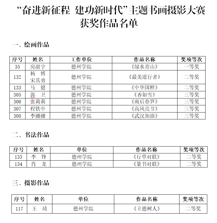 近日,山东省教育厅公布了“奋进新征程 建功新时代”主题书画摄影大赛获奖结果,美术学院教师房甜宇的作品《绿水青山》获绘画类一等奖,杨博、宋其勇、马健老师作品获绘画类二等奖,李锋、肖龙获书法类二等奖,郭卫、张莉莉、程铁中、李姗姗老师作品获绘画类三等奖。获奖数量与层次在同类院校中名列前茅。