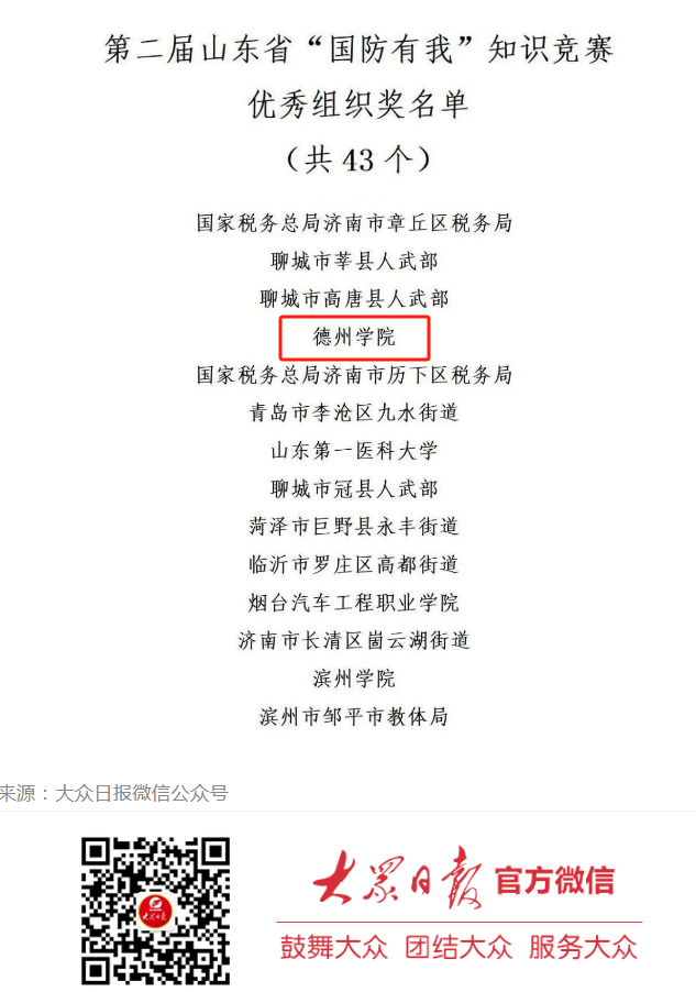 日前,由山东省委宣传部、山东省委省直机关工委、大众报业集团(大众日报社)、山东省总工会、共青团山东省委、山东省妇女联合会、山东省教育厅(省委教育工委)、山东省军区政治工作局、武警山东省总队等九部门联合主办的第二届山东省 “国防有我”知识竞赛圆满落下帷幕。