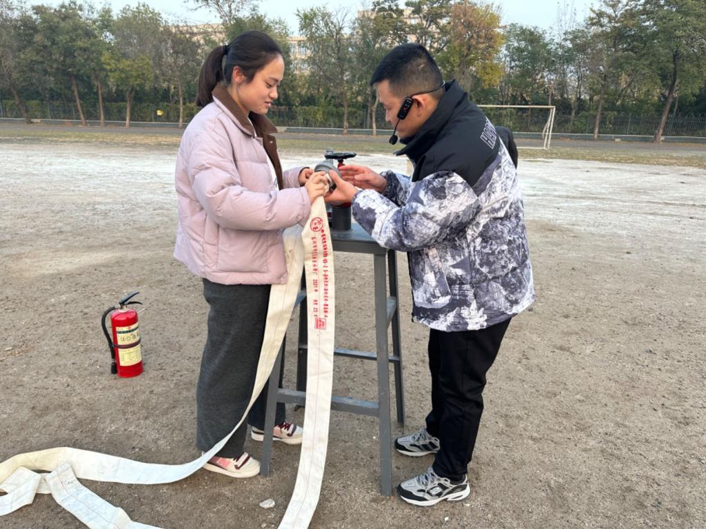 演练开始前,保卫处工作人员就消防常识、消防栓、水枪、水带的安装使用及灭火器的分类、使用要点等进行了详细讲解示范。