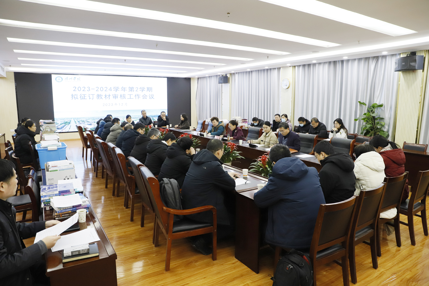 为做好2023-2024学年第2学期教材征订工作,12月26日上午,学校在厚德楼2楼报告厅召开2023-2024学年第2学期拟选用教材审核工作会议。党委委员、副校长徐静主持会议,党委委员、宣传部(教师工作部)部长冯琨出席会议。