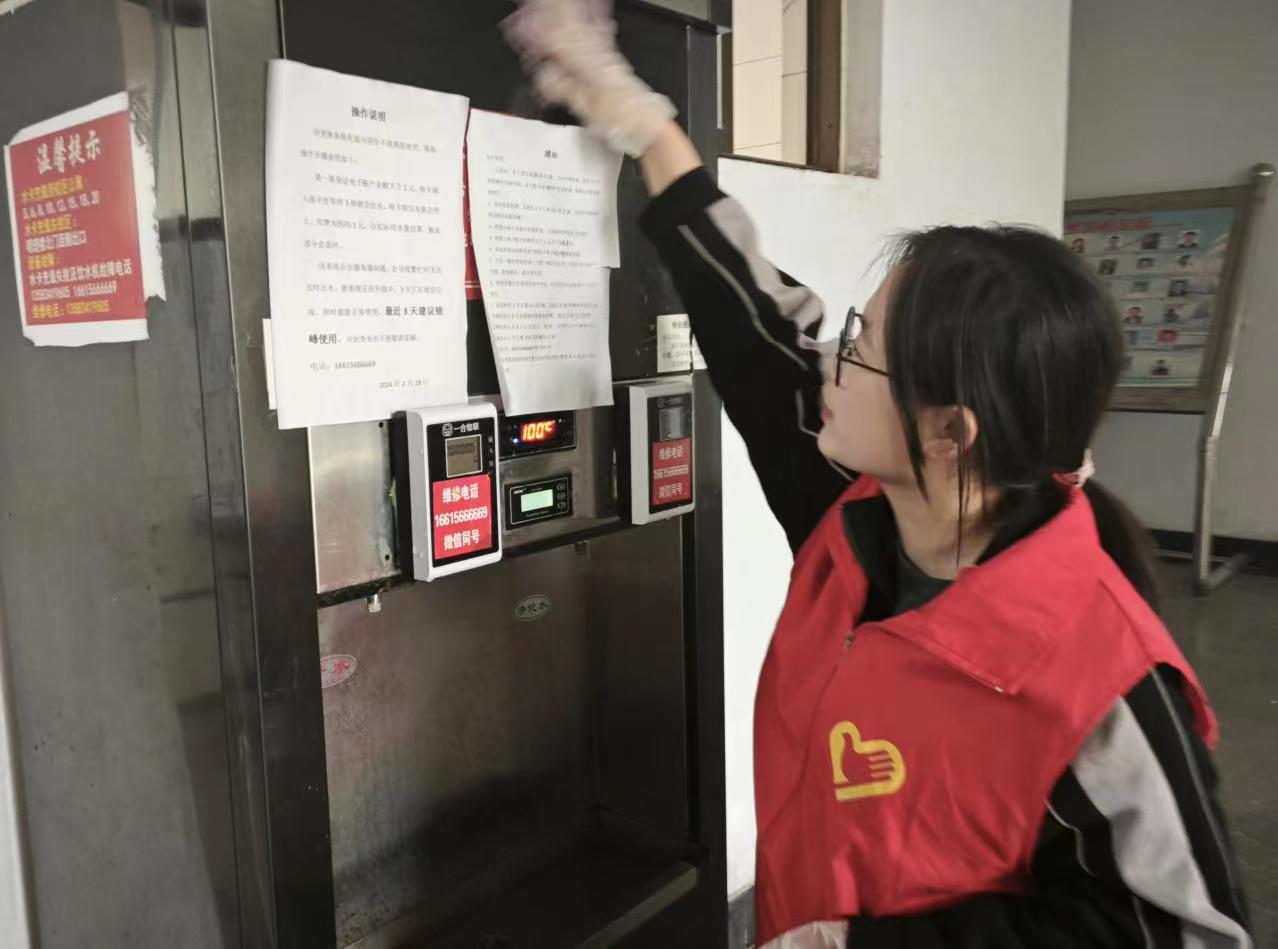 活动中,志愿者们认真准备了清洁工具,在听取了任务分工后迅速投入到行动中。在每层楼的饮水机旁,都可以看到志愿者们认真负责、全身心投入的身影。他们细致地检查每一层的饮水机,对水槽内的茶叶、柠檬片等残渣进行清理的同时做了消毒处理。此外,志愿者还对每个饮水机的外壳进行了擦拭,确保在外观上干净整洁。在大家的团结协作下,饮水机清理工作保质高效的完成,焕然一新的饮水机为师生们营造了良好的饮水环境。