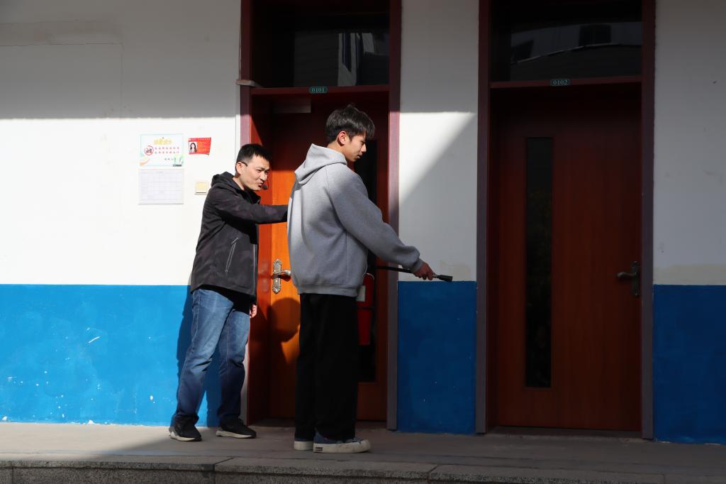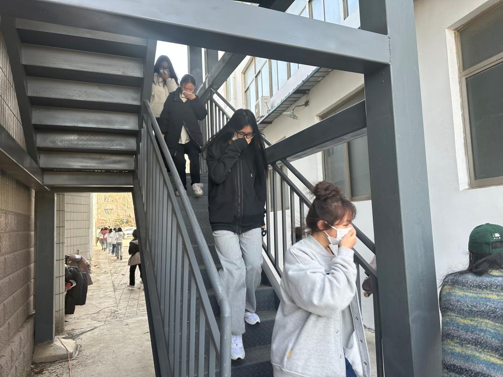 随后,消防演练正式开始。全体同学用毛巾捂住口鼻,有序撤离。