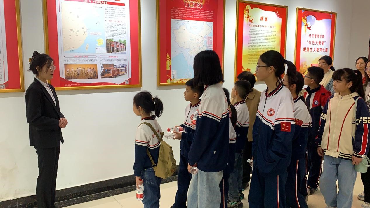 在经济管理学院党建爱国主义教育基地,讲解员带领同学们通过红色革命先烈、红色大讲堂、有声党史学习站、青年寄语等多个部分的参观,清晰直观的领略了中国共产党的光辉历程,激励着青少年赓续英烈精神,汲取奋斗力量,传承爱国情怀,发扬红色品格。