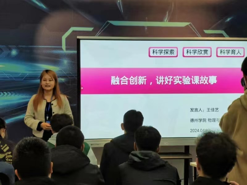 4月13日,物理与电子信息学院的2021级物理学(师范)专业王佳艺同学应邀在全国大学生物理实验竞赛(创新)山东地区研讨会上,做了题为“融合创新,讲好实验课故事”的报告,分享了她获得第九届全国大学生物理实验竞赛(创新)讲课类一等奖的经验。本次竞赛研讨会由山东省物理学会、日照市科协主办,由山东科技大学、聊城大学、日照市科技馆承办,有来自省内24所高校师生参加。