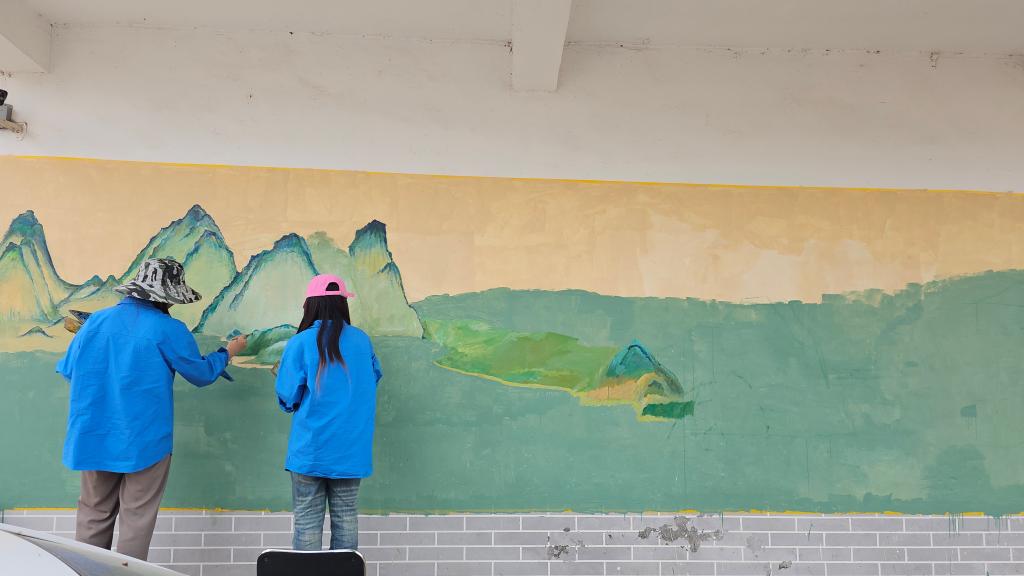 在绘制过程中,志愿者们充分发挥艺术设计特长,他们手拿刷子、滚筒,调颜料、勾轮廓、图色彩,反复打磨每一面墙绘,认真勾勒每一个细节,根据绘制内容合理分工,默契配合。