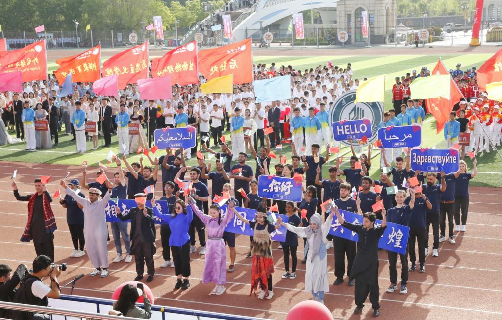 4月25日上午,beat3652024年田径运动会盛大开幕。国际教育学院精心准备,组织留学生积极参与本次运动会。在25日上午的开幕式上,由来自巴基斯坦、俄罗斯、斯里兰卡、乌兹别克斯坦、也门、蒙古等十余国家的留学生组成的方阵队伍精彩亮相。他们手执五星红旗和各国国旗,意气风发地步入会场,留学生代表身着各国民族传统服饰,向主席台鞠躬致意,同时高举各国语言的“你好”字牌,借此机会向beat365全体师生致以最诚挚的问候。
