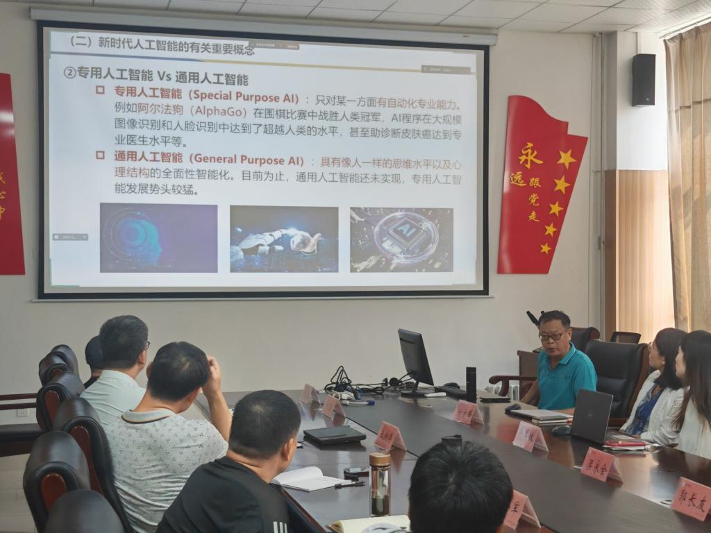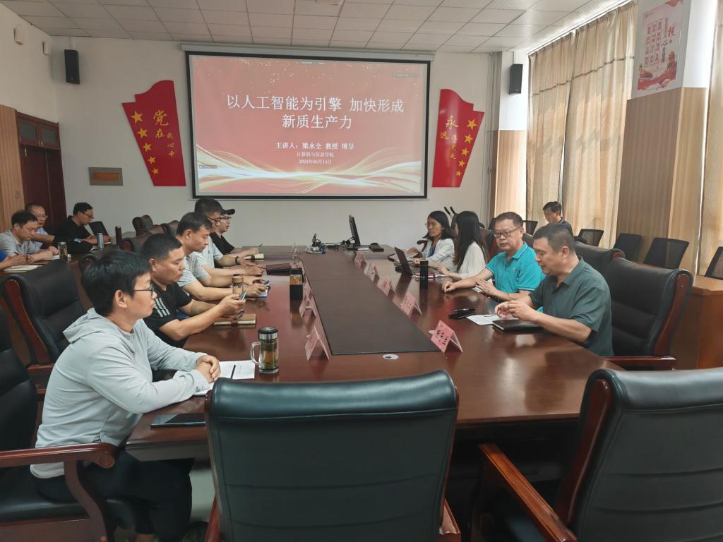 梁永全教授作题为《以人工智能为引擎 加快形成新质生产力》的报告。梁永全教授的报告围绕新时代人工智能的相关概念、新质生产力、人工智能助推新质生产力等三个方面,重点讲述了判别式AI、生成式AI,专业人工智能、通用人工智能,弱人工智能、强人工智能,语言、视觉、多模态等大模型,新质生产力的内涵,人工智能如何助推新质生产力、全面推进中国人工智能高质量发展。参会的教学人员针对我们开设的人工智能专业在教学过程中遇到的问题与梁教授进行了深入的探讨。