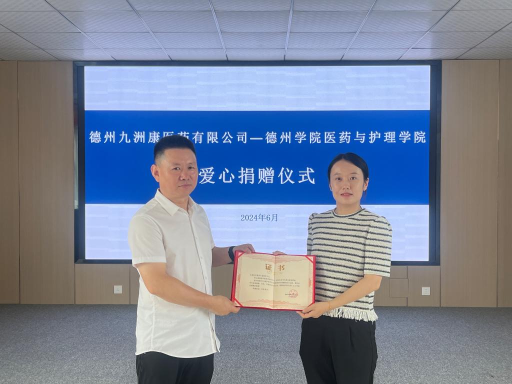 同时,为表示九洲康医药有限公司对医药与护理学院资助育人工作的支持与感谢,医药与护理学院相关负责人为企业颁发捐赠证书,此次爱心捐赠仪式将致力于推动医药与护理学院资助工作的发展。