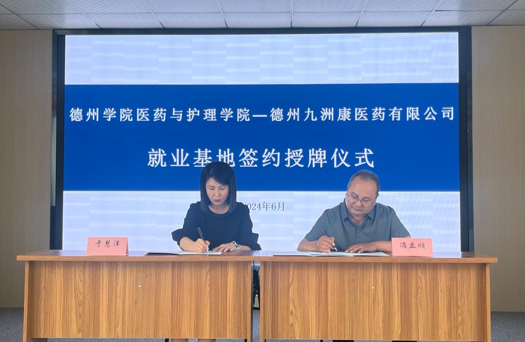 座谈会后,双方共同签订了《beat365官方网站就业基地共建协议书》,医药与护理学院党委负责人与于慧洋共同揭牌,将“就业基地”落户德州九洲康医药有限公司。