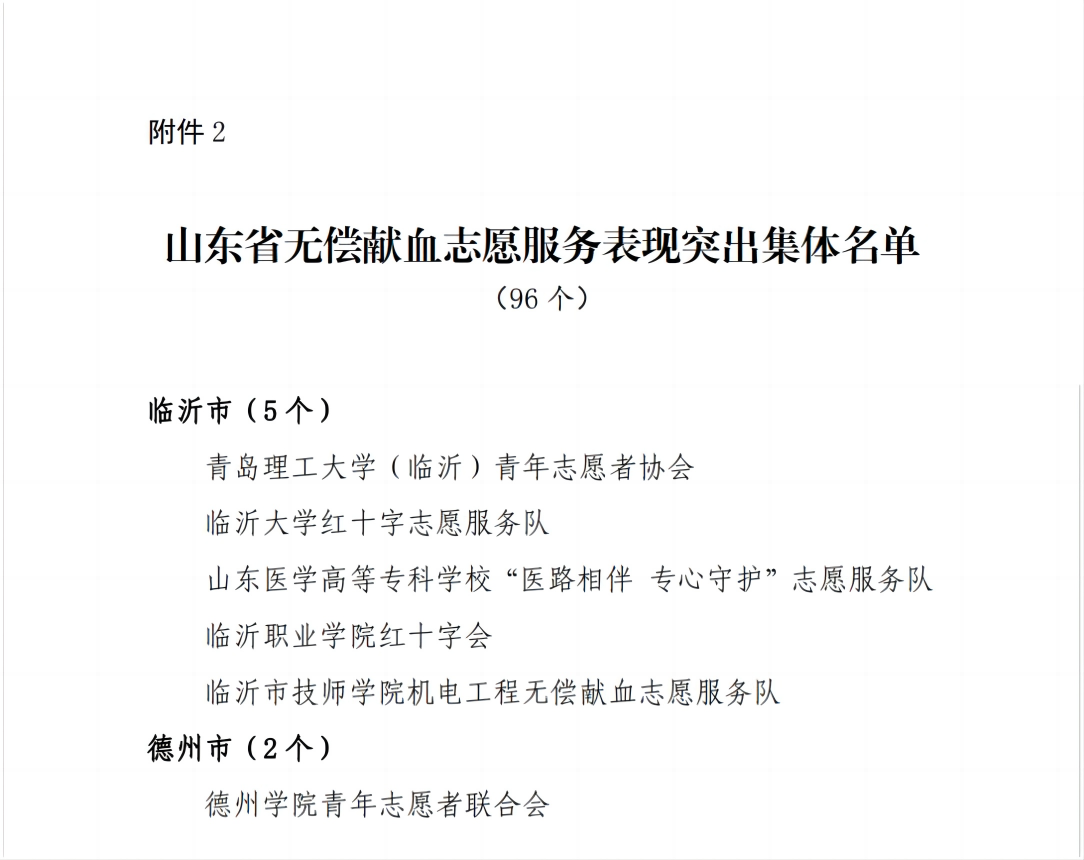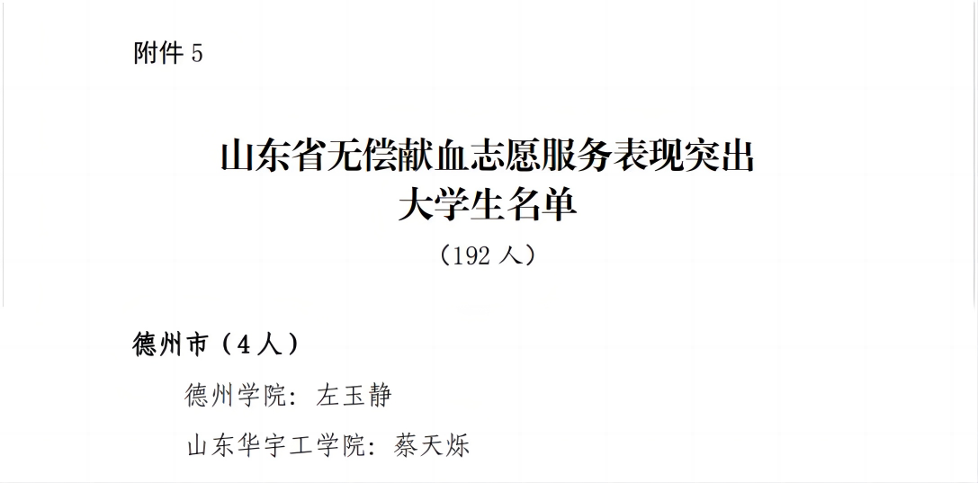 近日,由山东省卫生健康委员会、山东省教育厅、山东省人力资源和社会保障厅、共青团山东省委、山东省红十字会联合发布《关于表扬2023年度山东省高校无偿献血表现突出集体及个人的通报》,对2023年在无偿献血工作中表现突出的集体及个人进行表扬。