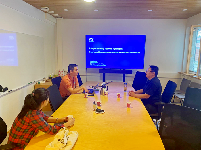 研修团成员拜访了阿尔托大学的软物质领域知名的青年科学家张航教授,听取了张教授对近年开展工作的报告,就软物质领域的科学问题进行了深度交流。双方在未来的成果培育、课题申报等事项达成合作共识。
