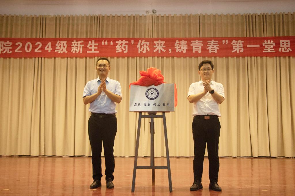 9月3日,药学院在求实楼4009报告厅举行院徽、院训揭牌仪式。校党委委员、副校长蒋涛涛为药学院院徽、院训揭牌,学院领导班子、系主任、辅导员、新生班主任以及2024级全体新生参加活动。