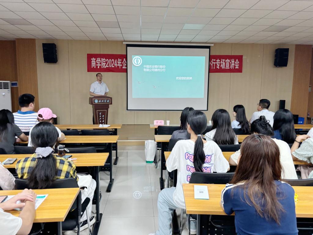 宣讲会上,中国农业银行德州分行团委副书记贾虎介绍了中国农业银行的企业文化、发展历程、业务范围及未来规划,重点分享了该行的人才需求、培养计划以及员工职业发展路径。同时,对毕业生们关心的薪资待遇、工作环境、晋升机制等问题进行了详细介绍。
