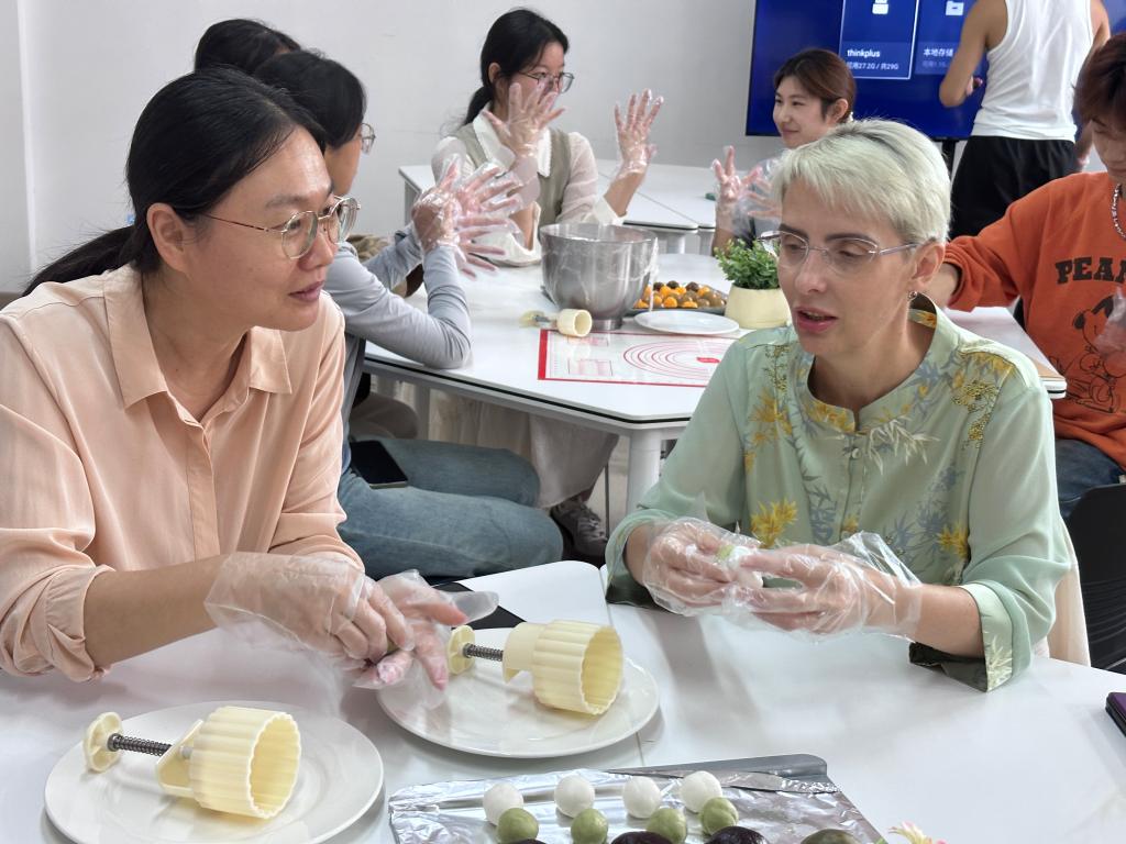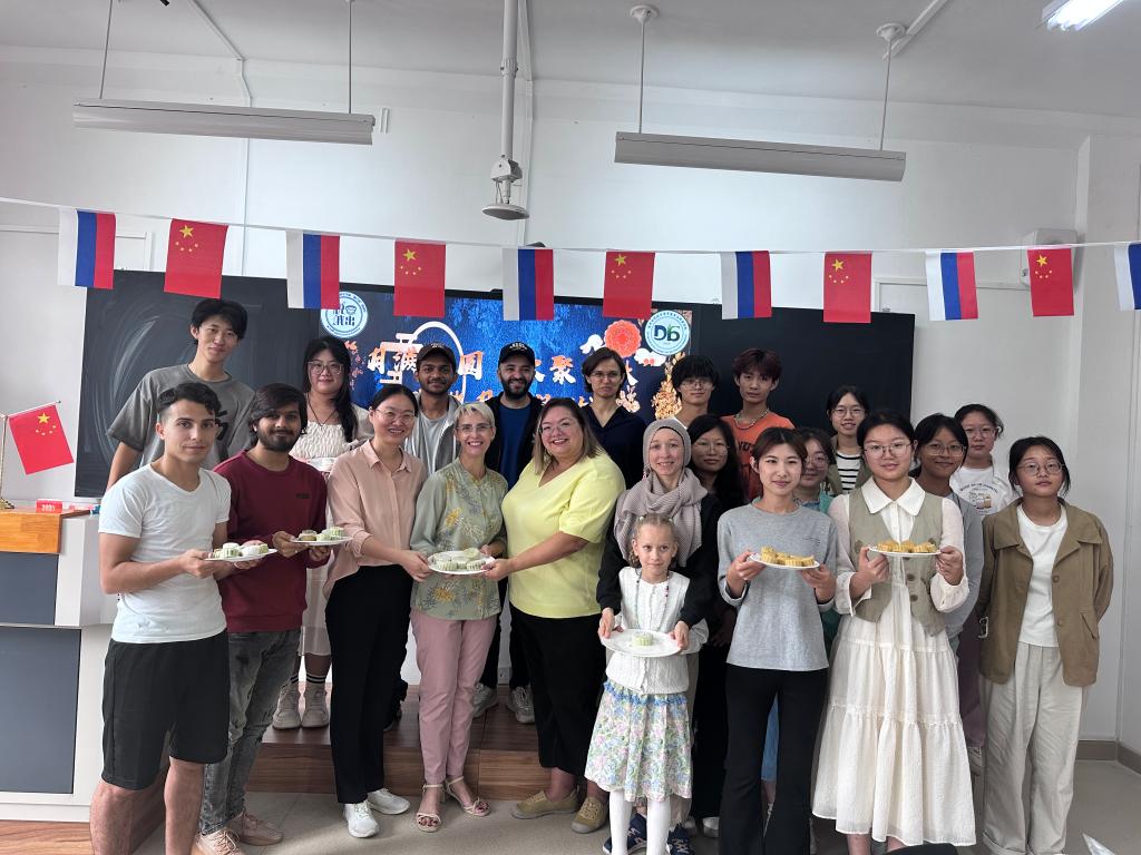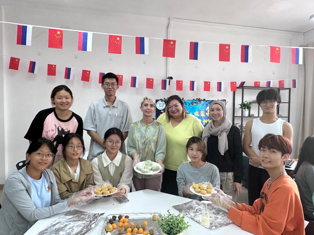 别尔哥罗德食品科学学院师生与来自俄罗斯、巴基斯坦、也门等国家的师生欢聚一堂,活动现场热闹非凡。活动伊始,副院长张红介绍了中国传统美食月饼的起源及各地不同风味月饼的特色,并一同观看了月饼制作的视频。
