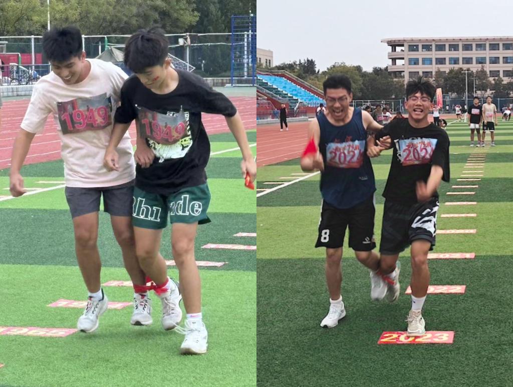 在“红色接力”两人三足跑项目中,以学院为单位的参赛队员两两分组,他们将内侧腿用红色带子绑在一起,奋力在年份地标的不断闪现中进行75米接力,每一米都象征着新中国走过的每一年,队员们步伐一致、勇往直前,充分展现出团结协作的强大力量。他们在奔跑中仿佛与历史同行,铭记着前辈的荣誉,坚定地迈向未来。