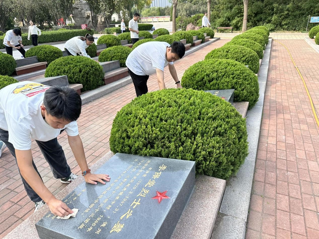 宣誓默哀仪式结束后,同学们分组开展了擦墓碑活动。他们认真仔细地擦拭着每一块墓碑,清理着陵园内的杂草和垃圾。在擦拭过程中,同学们仔细阅读了墓碑上的烈士生平简介,了解了先烈们的英勇事迹和革命精神。