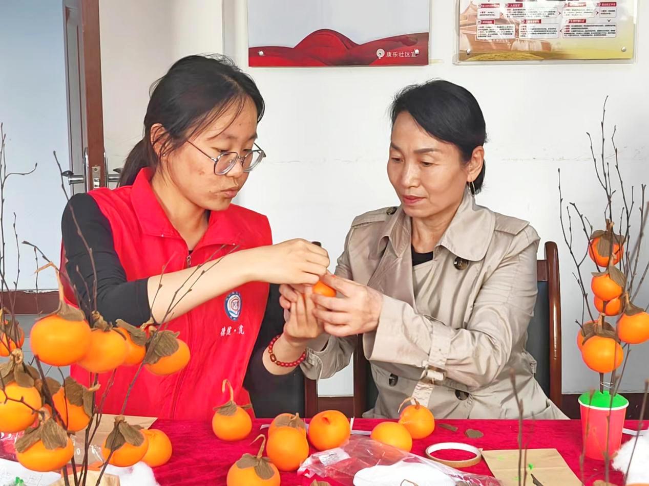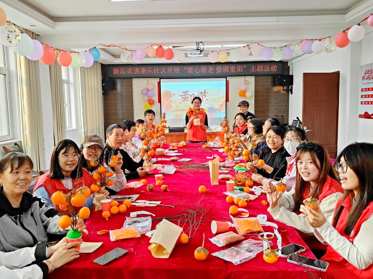 化学化工学院在康乐社区开展“九九重阳,久久陪伴”手工制作活动,邀请老年居民提前共贺九九重阳。在志愿者的指导下学习如何制作寓意“事事如意”的柿子树。通过选材、编织到填充柿子等步骤,居民朋友们不仅体验到了传统手工工艺的魅力,还增进了大家对中国传统文化的认识与热爱。活动中还设置了关于重阳节文化知识的小科普,向大家普及了重阳登高望远的历史背景及意义。志愿者与居民朋友们一起切“九九重阳节”蛋糕,为老人们集体过生日,共祝美好心愿、共唱祖国颂歌,共度一个温暖充实、欢乐祥和、令人难忘的重阳节。