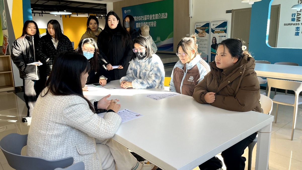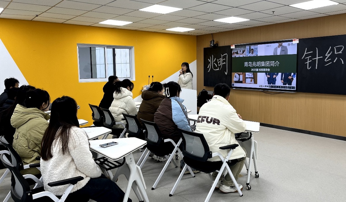 12月18日,纺织服装学院邀请青岛兆明针织有限公司在大学生就业创业赋能中心开展校园专场招聘会,纺织服装学院负责人、毕业生辅导员以及2025届毕业生参加。