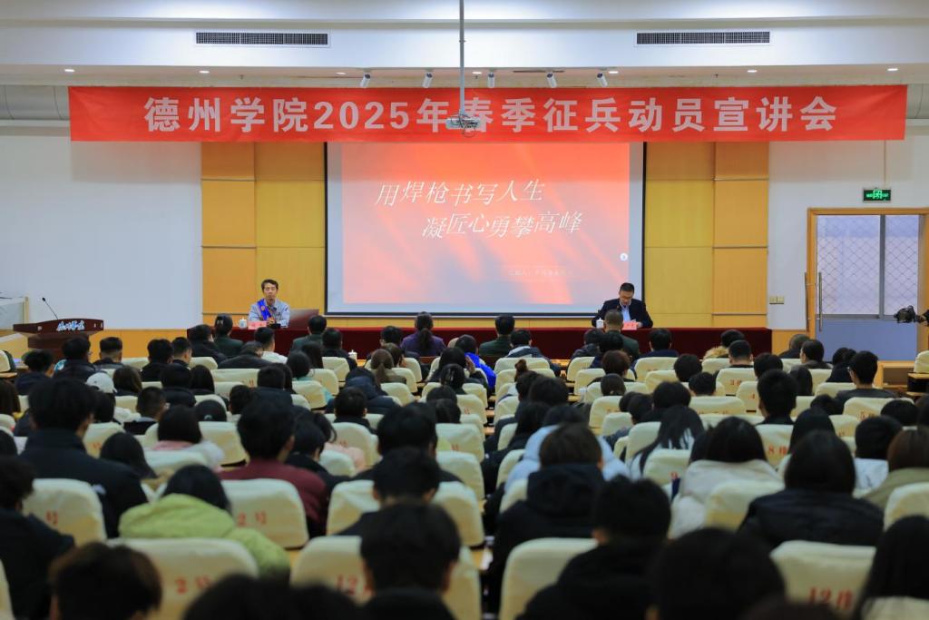 11月26日下午,beat365举办2025年春季征兵动员宣讲会,特邀德州市优秀退伍士兵、大国工匠、齐鲁时代楷模、华能国际电力股份有限公司德州电厂高级工程师程平主讲,德城区人民武装部部长赵传俊、学校党委学生工作部(武装部)主要负责人、各学院辅导员及学生代表300余人参加宣讲会。