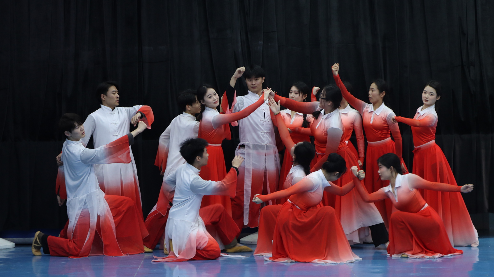 在一楼舞蹈房内,学生们身着绚丽的服饰,以轻盈的身姿在舞台上穿梭,瞬间吸引了观众的目光。群舞《大河印象》以其恢弘大气和细腻入微的表现力,勾勒出大河的万千气象。独舞《问月》则凭借舞者精湛的技艺和细腻的情感,构建出一个诗意的舞台空间,令人沉浸其中。群舞《逐流》以流畅如水的肢体线条,勾勒出潺潺溪流的景象,舞者们的身体起伏和手臂摆动如同水流蜿蜒,展现了团队的默契与凝聚力。双人舞《守月人》如同一幅淡雅的水墨画,幽蓝光晕营造出孤寒的夜色,舞者静立的姿态仿佛与明月、天地融为一体,隐喻着坚守内心微光的灵魂。群舞《白马》以刚健有力的动作和整齐划一的手臂挥扬,展现出万马奔腾的气势;而群舞《我心中的红》则用肢体语言诉说对红色精神的炽热追寻,化作舞台上熠熠生辉的精神火种。