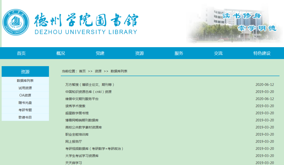 图书馆主页内容丰富,有中外文数据库列表,书目检索、远程访问等服务窗口,还有通知公告信息等内容。链接:http://libnew.dzu.edu.cn/index.htm。其中电子资源包括中外文电子数据库20个。