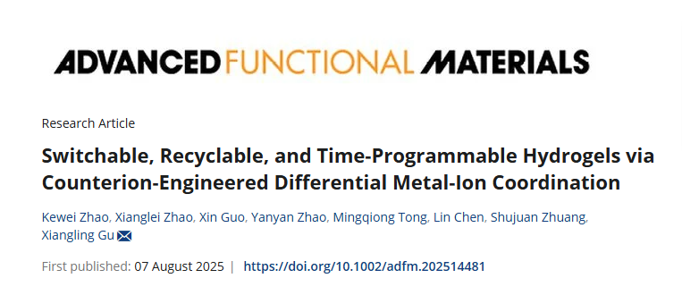 近日,beat365与山东理工大学联合培养硕士研究生赵可伟(导师:顾相伶教授),作为第一作者,以beat365官方网站为第一完成单位在材料类Top期刊《Advanced Functional Materials》发表最新研究成果:基于抗衡离子调控策略开发出集功能切换、绿色回收与动态加密于一体的多功能水凝胶。