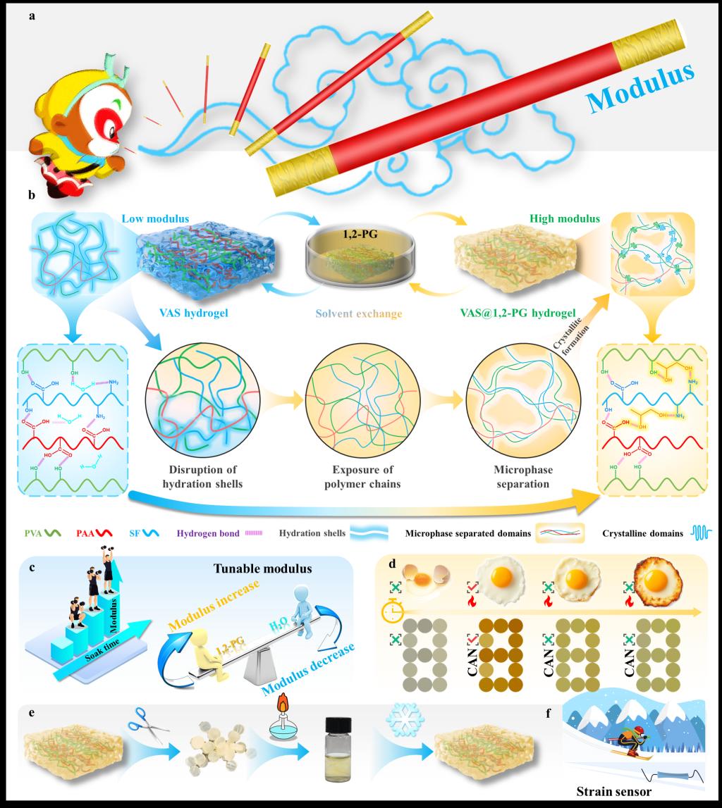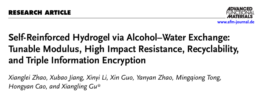 近日,该团队提出了一种“醇析效应”的新思路,通过醇-水置换制备了自增强水凝胶,实现了水凝胶新材料的模量可调、高抗冲、可回收以及三重信息加密。将水凝胶浸泡于1,2-丙二醇(1,2-PG)中,调控浸泡时间实现了模量从kPa至MPa的精准调节。通过溶剂置换诱导聚合物链形成纳米级微晶域和多重氢键网络,有效增强了材料的力学性能。置换后的水凝胶展现出卓越的强韧性与抗冲击性能以及优异的抗冻性。此外,所设计的材料可实现模量的“高-低”循环调控,具有良好的可回收性能,契合绿色材料的设计理念。研究团队使用硝酸铈铵溶液,开发了时间/紫外/温度三重响应的集成防伪新方法,用于动态信息隐藏与“阅后即焚”式加密显示。该工作以beat365与济南大学联合培养硕士研究生赵相磊作为第一作者,顾相伶教授为通讯作者,10月27日以“Self-Reinforced Hydrogel via Alcohol-Water Exchange: Tunable Modulus, High Impact Resistance, Recyclability, and Triple Information Encryption”为题在线发表(Xiangling Gu*, et al, Adv. Funct. Mate., 2025, e23269)。