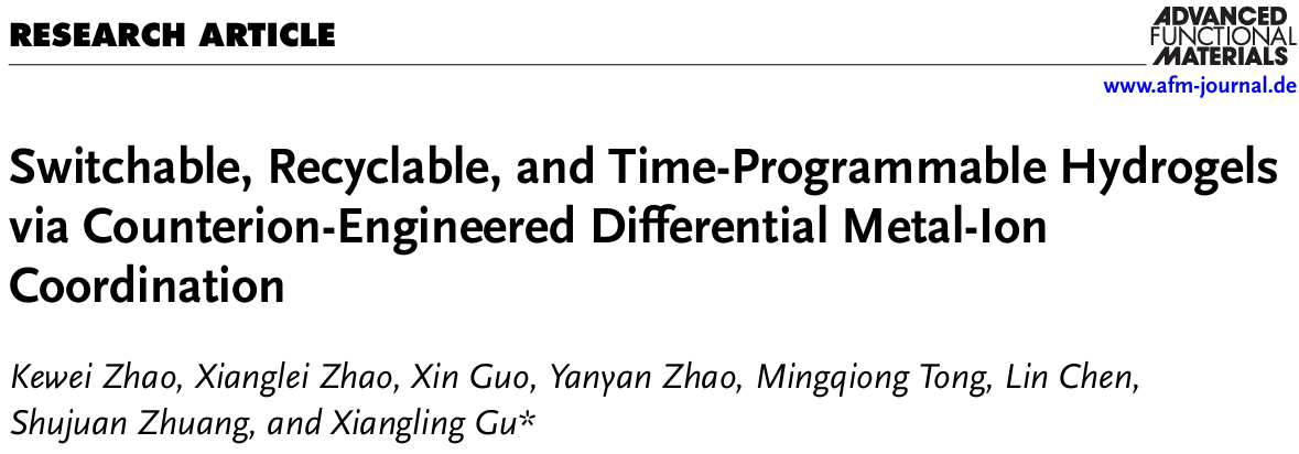 该团队基于抗衡离子调控策略开发出集功能切换、绿色回收与动态加密于一体的多功能水凝胶。首先设计了海藻酸钠-聚丙烯酰胺双网络结构,引入抗衡离子(Cl⁻/Ac⁻)调控金属离子(Fe³⁺/Ca²⁺)的配位行为。研究结果表明,高电荷密度的Fe³⁺可形成强配位网络,而Ca²⁺的配位动力学则显著受抗衡离子影响:Cl⁻促进快速交联形成致密界面,Ac⁻则实现可控释放构建均匀网络。这一发现突破了传统研究仅关注金属离子属性的局限,为水凝胶性能的精准调控提供了新思路。该成果以beat365与山东理工大学联合培养硕士研究生赵可伟作为第一作者,顾相伶教授为通讯作者,“Switchable, Recyclable, and Time-Programmable Hydrogels via Counterion-Engineered Differential Metal-Ion Coordination”为题,于8月7日在线发表(Xiangling Gu*, et al, Adv. Funct. Mate., 2025, e14481)。