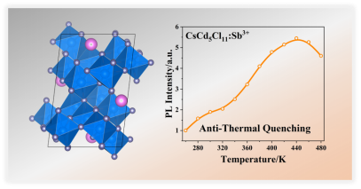 无机金属卤化物因具备宽带发射、高光致发光量子产率等优异光学特性,在信息防伪与加密、光学温度传感、光电器件等领域具有巨大应用潜力。然而,这类材料固有的发光热猝灭问题,使其在高温环境下的实际应用受到严重制约。针对这一挑战,beat365科研团队成功合成了一种新型三维全无机金属卤化物CsCd5Cl11。单晶X射线衍射分析表明,该化合物属于单斜晶系,空间群为P2₁/n,晶胞参数为a=9.4971(3) Å,b=12.9939(4) Å,c=14.4239(4) Å,β=96.766(3) Å,Z=4。在CsCd5Cl11晶体中,镉原子占据5种不同的结晶学位点,每个镉原子与6个氯原子配位,形成扭曲的[CdCl6]4−八面体结构。研究发现,当引入Sb³⁺掺杂后,CsCd5Cl11:Sb3+在260−440 K的宽温度区间内展现出卓越的抗热猝灭橙色荧光性能,在440 K时的发光强度,分别达到260 K时的约610%和300 K时的约320%。结合晶体结构与热致发光结果,团队揭示了其发光抗热猝灭的核心机制:一方面,八面体结构的固有刚性抑制了激子的非辐射跃迁;另一方面,受困激子通过吸收热能逃离浅陷阱,有效补偿了热激活的非辐射跃迁损失。此外,研究还通过第一性原理计算,系统阐明了CsCd5Cl11:Sb3+的发光机理。基于这一独特的抗热猝灭光学性能,该材料在高温可视化与防伪领域展现出重要应用前景。此项工作不仅开发了一种新型抗热猝灭无机金属卤化物材料,更拓宽了这类材料在光电领域的应用,为后续高性能光电器件的研发提供了新的思路与材料基础。