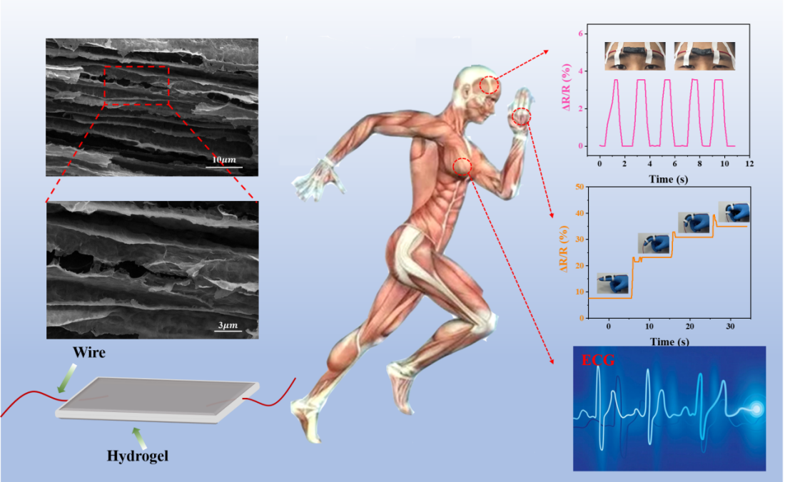 水凝胶是一类重要的软物质材料,具有丰富的特性和广泛的应用,这主要得益于其特有的三维网络结构。设计具有定向孔道结构的水凝胶对调控其性能、拓展其应用具有重要的意义。该课题组开展了系列探索,以研究多糖水凝胶三维网络的形成机制。通过多种手段跟踪酸性水溶液中冰晶的形成过程。以三元酸柠檬酸为调控手段进行探讨,发现阴离子在空间的有序延伸在水凝胶定向微结构的构建中起着决定性作用。所添加的二维MXene纳米片均匀分布在微通道结构中,显著增强了水凝胶的电导率。基于定向孔道微结构水凝胶组装形成的柔性传感器对外界刺激的响应时间仅为200ms,可灵敏、准确、即时地检测人体多尺度生理活动,并可替代临床使用的金属电极用于心电测试。因此,所报道的简易、温和、有效的水凝胶微结构调控策略,为制备具有高度取向结构的软物质材料开辟新的领域。