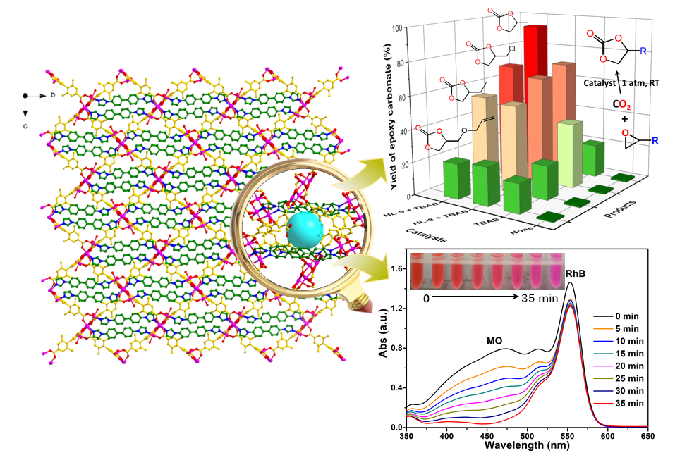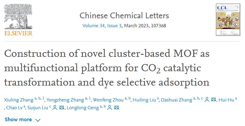 近日,山东省硅单晶单导体材料与技术重点实验室(筹)带头人张秀玲教授、化学化工学院耿龙龙副教授、张大帅副教授与江西理工大学刘遂军副教授合作,发挥山东省青创团队学科交叉优势,在多功能框架催化材料设计与应用领域取得重要进展,相关研究成果以“Construction of novel cluster-based MOF as multifunctional platform for CO2 catalytic transformation and dye selective adsorption”为题发表在国际知名期刊《Chinese Chemical Letters》(IF:8.455,中科院一区,TOP期刊)。
