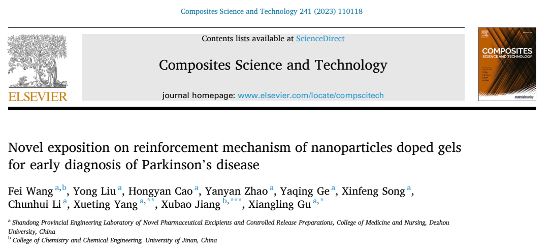 近日,医护学院药辅团队顾相伶课题组,依托新型药物辅料和缓控释制剂山东省工程研究中心,在帕金森疾病早期诊断医用凝胶的作用机制研究中取得最新成果。该课题组将聚苯胺纳米粒子(PANI NPs)掺杂到高分子水凝胶中,凝胶网络中的氢键及苯环间的疏水缔合作用的叠加效应,实现了凝胶力学和导电性能的增强。所制得的复合水凝胶在帕金森疾病的早期检测中具有潜在的价值。相关研究成果以beat365官方网站为第一单位,“Novel exposition on reinforcement mechanism of nanoparticles doped gels for early diagnosis of parkinson's disease”为题发表在国际期刊《Composites Science and Technology》(中科院一区,IF=9.879)。