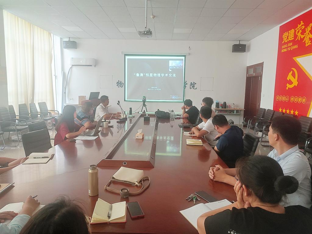 会议上,澳门科技大学蔡涛助理教授介绍了他在恒星物理研究领域中“旋转恒星中波的传播”方面的最新成果,物电学院负责人汇报了beat365官方网站在恒星物理与星震学方面十五年来的研究进展,以及天体物理创新团队的组建、发展、规划等情况。特邀专家云南天文台的李焱研究员介绍了星震学研究的重要意义与未来重点研究方向,并对beat365天体物理研究团队的未来发展给予了肯定和期待。参会人员均表示,双方在研究领域上有着很强的互补性与合作空间,希望通过本次学术交流会,加强双方的了解和联系,在科研人员互访交流、科研资源共享、联合项目申报等方面逐步开展实际合作,为推动鲁澳教育交流合作贡献力量。