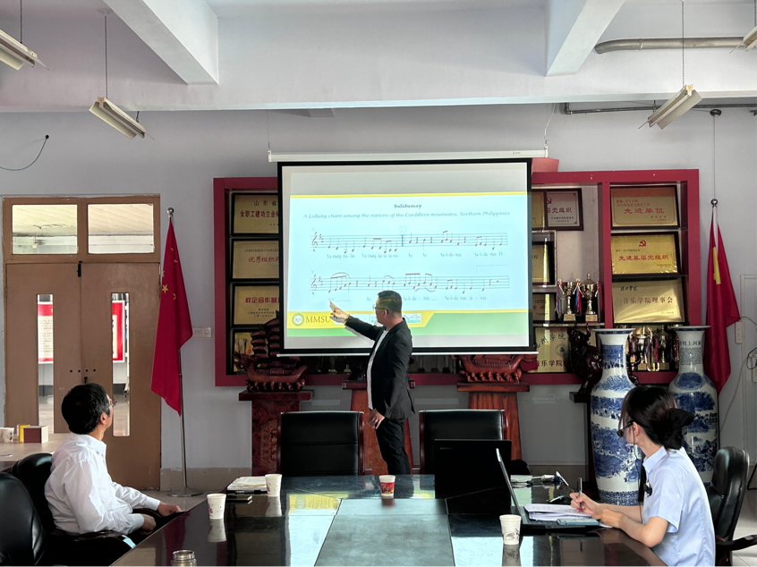 讲座中,老师们针对两国地方音乐的特征及传承展开了深入的交流和探讨,刘洋老师为瑞恩·塞缪尔·拉莫斯博士演唱了民歌《打开春天》,以表对他到访的欢迎与尊重。