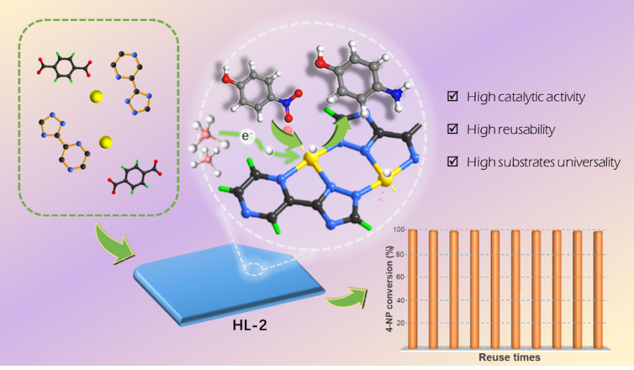 具有开放金属位点(OMS)功能的金属有机框架(MOFs)因其独特的电子特性以及与客体分子的相互作用而在各种应用中受到广泛关注。由于金属节点与连接体的饱和配位趋势,因此在合成MOFs的过程中精准调控金属节点的配位环境充满挑战。团队采用混合配体策略成功开发了三种具有不饱和Cu(II)位点的新型MOFs(HL-1~3)。值得注意的是,所获得的MOFs在温和条件(25°C和1atm)下可高效催化还原硝基芳烃,并表现出优异的催化活性和良好的可回收性。特别是,在HL-2上完全转化4-硝基苯酚(4-NP)仅需30秒,达到了创纪录的高TOF值。通过对HL-2的实验和理论研究发现,具有正电荷性质的开放式铜位点可以改善底物之间的吸附和随后的电子传输,从而实现底物的高效活化与催化转化。