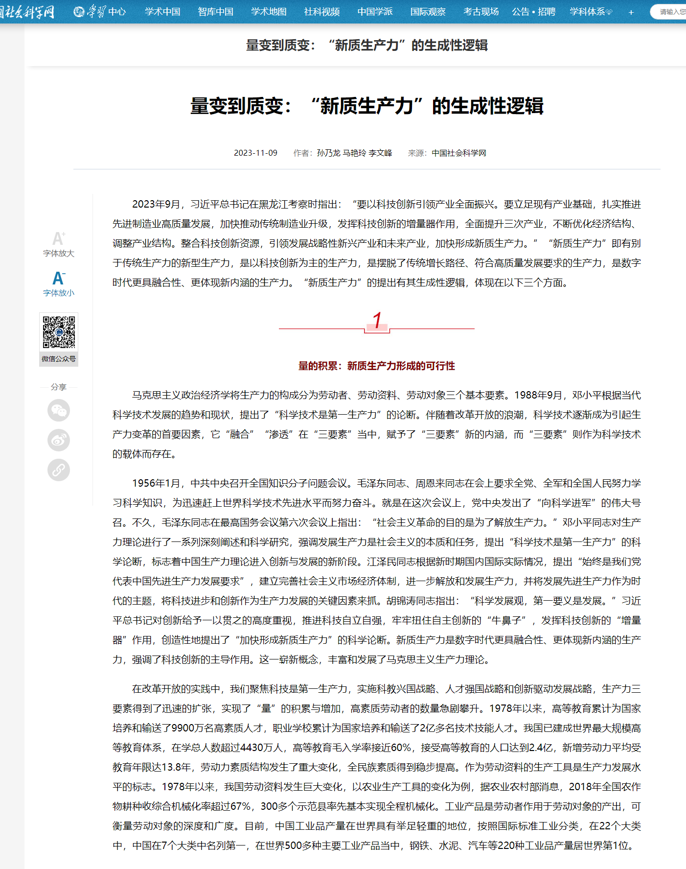 【中国社会科学网】量变到质变:“新质生产力”的生成性逻辑