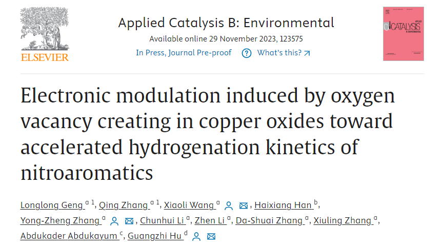 近日,山东省硅单晶单导体材料与技术重点实验室(筹)、化学化工学院耿龙龙副教授与同济大学韩海祥副教授、云南大学胡广志教授合作,发挥山东省青创团队学科交叉优势,在金属催化剂表界面调控领域取得重要进展,相关研究成果以“Electronic modulation induced by oxygen vacancy creating in copper oxides toward accelerated hydrogenation kinetics of nitroaromatics”为题发表在国际催化期刊《Applied Catalysis B: Environmental》(IF:22.1,中科院一区,TOP期刊)。