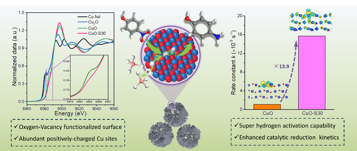 开发高效催化剂对提高化工生产效率,服务高端化工产业至关重要。通过空位工程可以精确调控催化剂的表界面微结构,是提升催化剂活性的有效策略。该工作通过水热-氧化串联工艺制备了一系列氧空位(Ov)功能化氧化铜催化剂,并在芳香硝基化合物选择性加氢反应中表现出了优异的催化活性和循环稳定性。与块状氧化铜相比,最优的CuO-S30催化剂在温和条件下还原4-硝基苯酚的动力学性能提高了13倍以上,活化能显著降低。系列XRD、HRTEM、XANES、EXAFS及EPR等结构表征和DFT模拟证实了氧空位(Ov)在调控CuO-S30结构/电荷特性方面的关键作用:一方面Ov的存在可以诱导CuO-S30催化剂表面电荷重构,产生Cuδ+物种,有利于促进反应物在金属位点上的吸附和活化;另一方面,Ov还可以调控催化剂的氧化还原性质,促进反应过程中电荷的高效转移,最终实现催化性能提升。这项工作为金属催化剂表界面结构/电荷调控提供了有效策略,相关结构-活性关系为设计具有更高催化性能的先进催化材料开发提供借鉴。