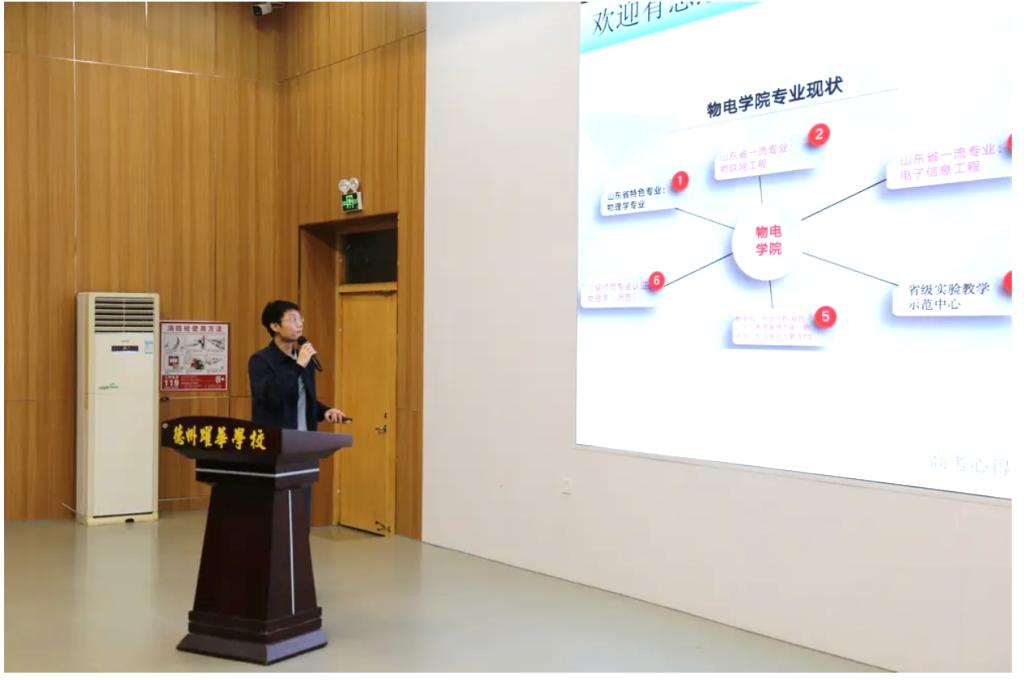 4月26日,物理与电子信息学院教师李子川博士受德州跃华学校邀请为该校高三年级全体学生做了题为“为梦想而战,因热爱前行”的主题报告。本次报告在跃华学校报告厅举行,分为文理两个专场。跃华学校高三年级全体同学及相关班主任参加了本次活动。