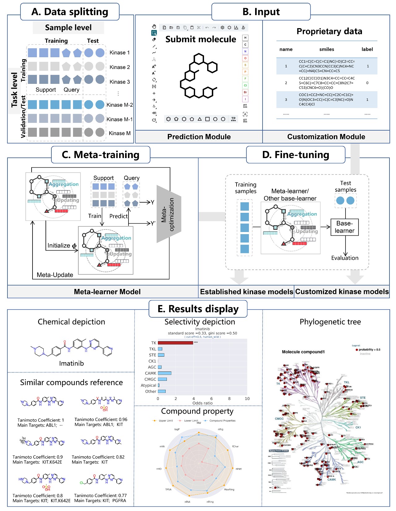 图1. KinomeMETA平台概览。(A)数据划分策略。(B)模块输入格式。其中预测模块输入分子结构。定制模块输入分子结构及其在目标激酶上的活性标签。(C)KinomeMETA的元训练过程。(D)KinomeMETA的微调过程。已建立的激酶模型通过微调元学习器得到。用户提交的私有数据根据研究目的用于微调元学习器或已建立的激酶模型。(E)预测模块的结果展示,包括相似结构的激酶抑制剂及其主要靶点,激酶选择性评估、系统发生树和分子性质。