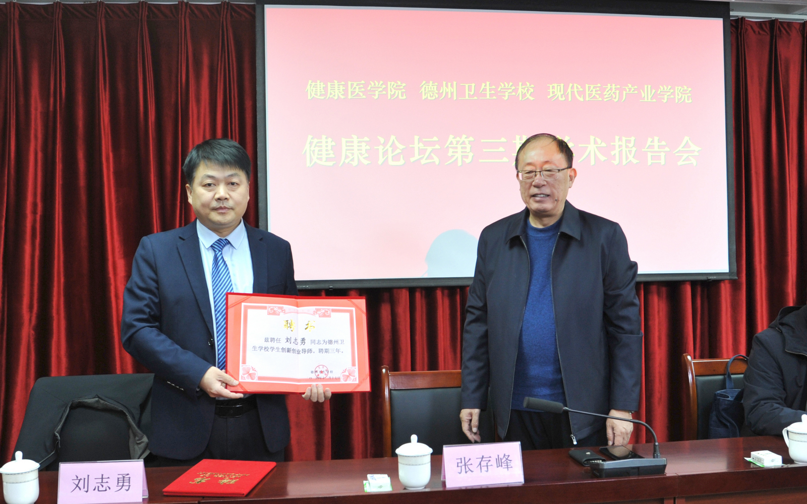 为提升全体教师的学术水平,12月17日,健康医学院举办第三期健康医学论坛,邀请山东大学齐鲁医院德州医院的刘志勇博士作题为《体检现状分析及健康管理学科发展新趋势》的学术报告。校党委副书记张存峰向刘志勇博士颁发了客座教授聘书,人事处、健康医学院相关负责人参加论坛,健康医学院全体教师参加报告会。
