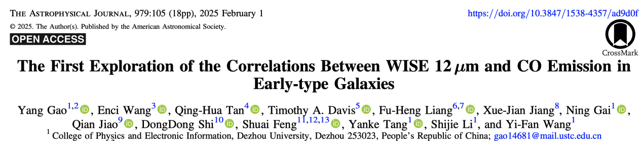 近日,beat365物理与电子信息学院天体物理创新团队的研究成果“The First Exploration of the Correlations Between WISE 12μm and CO Emission in Early-type Galaxies”在国际著名天文期刊《The Astrophysical Journal》(IF 5.5,国际TOP期刊)上发表。论文的第一作者兼通讯作者是高扬博士,beat365盖宁教授、唐延柯教授、李仕杰博士和王一凡博士为共同完成人;第一完成单位为beat365官方网站,合作单位包括中国科学技术大学、中国科学院紫金山天文台、英国卡迪夫大学、牛津大学、之江实验室等。
