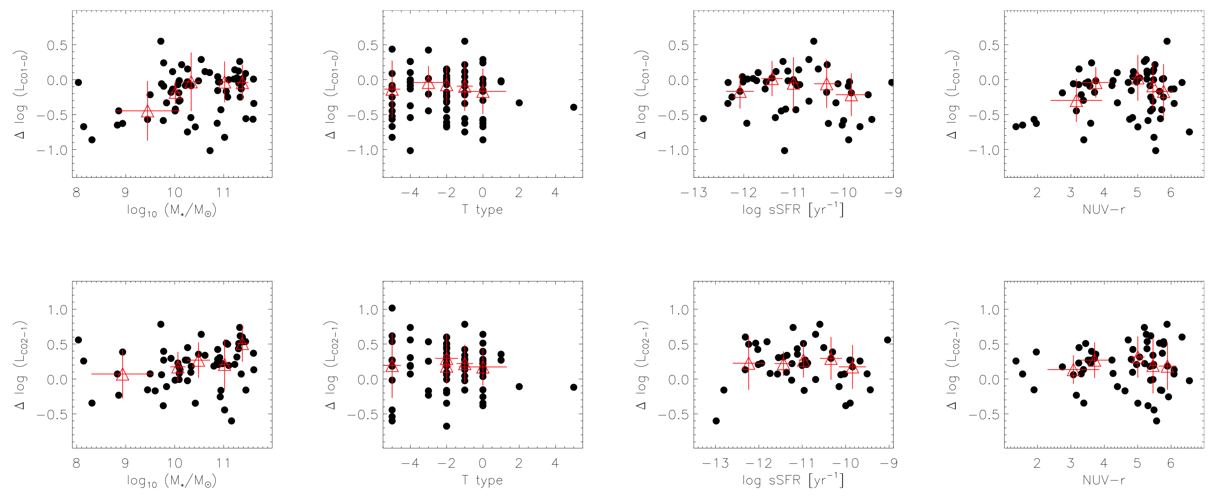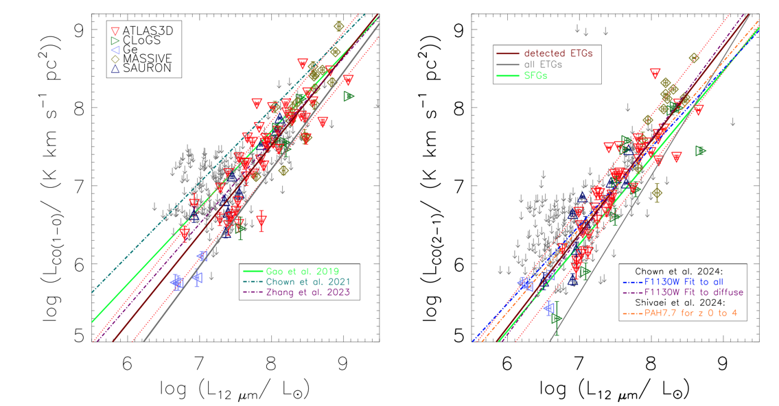研究发现,早型星系中CO(1–0)与CO(2–1)的线比跟中红外辐射强度无关。这一现象与恒星形成星系中的显著不同,暗示了ETGs中分子气体辐射机制的独特性。而CO与12 μm辐射的相关性在早型星系和恒星形成星系中的差异与星系整体性质(如颜色、形态、比恒星形成率)无关,但与分子气体质量面密度密切相关。通过减去12 μm辐射中可能来自老年恒星的贡献,或采用不同的αCO值,可以消除这些偏差。研究进一步指出,增加一个恒定的CO面密度也可以解释这些偏差,这可能暗示了中红外辐射能示踪CO-dark气体。
