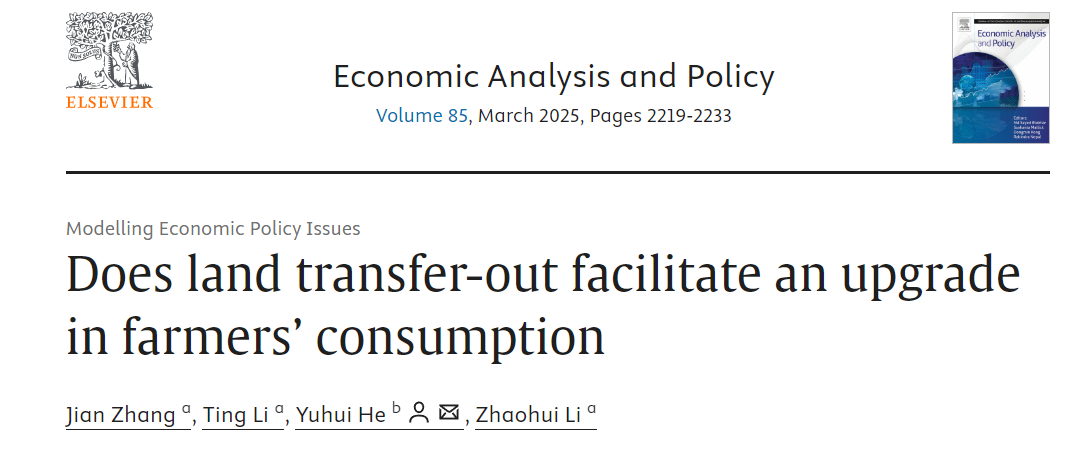近日,beat365商学院经济实验与智能商务管理团队在国际经济学知名期刊《Economic Analysis and Policy》(IF 7.9,中科院二区)上发表学术论文“ Does Land Transfer-out Facilitate An Upgrade In Farmers' Consumption ”。论文第一作者为张建博士,beat365李亭教授、李朝辉教授为共同完成人,第一署名单位为beat365官方网站,研究得到济南土地储备中心何宇晖研究员的指导,并作为该文的共同通讯作者。