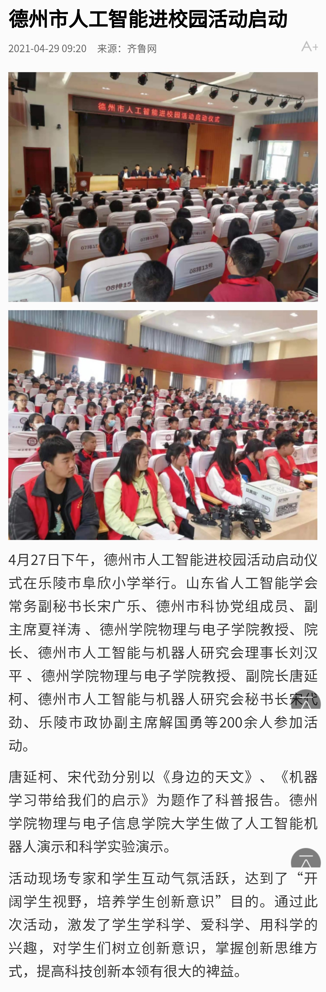 【齐鲁网】德州市人工智能进校园活动启动