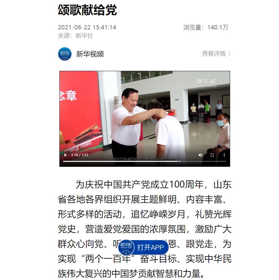 为庆祝中国共产党成立100周年,山东省各地各界组织开展主题鲜明、内容丰富、形式多样的活动,追忆峥嵘岁月,礼赞光辉党史,营造爱党爱国的浓厚氛围,激励广大群众心向党、听党话、感党恩、跟党走,为实现“两个一百年”奋斗目标、实现中华民族伟大复兴的中国梦贡献智慧和力量。在中国共产党百年华诞即将到来之际,beat365官方网站在博文楼一楼大厅举行“光荣在党50年”纪念章颁发仪式。校党委书记车滨出席仪式并讲话,党委副书记王金利,党委委员、副校长张明征,党委委员、纪委书记、省监委驻beat365官方网站监察专员刘继泉,党委委员、组织部部长、统战部部长杨恩红,党委委员、宣传部(教师工作部)部长任立春出席。38名“光荣在党50年”纪念章获得者代表参加仪式。仪式由王金利主持。由新华社音视频部、新华社山东分社、山东省委网信办、新华网山东频道联合出品的《颂歌献给党》在新华社上线,beat365举行“光荣在党50年”纪念章颁发仪式,浏览量超过140万次。