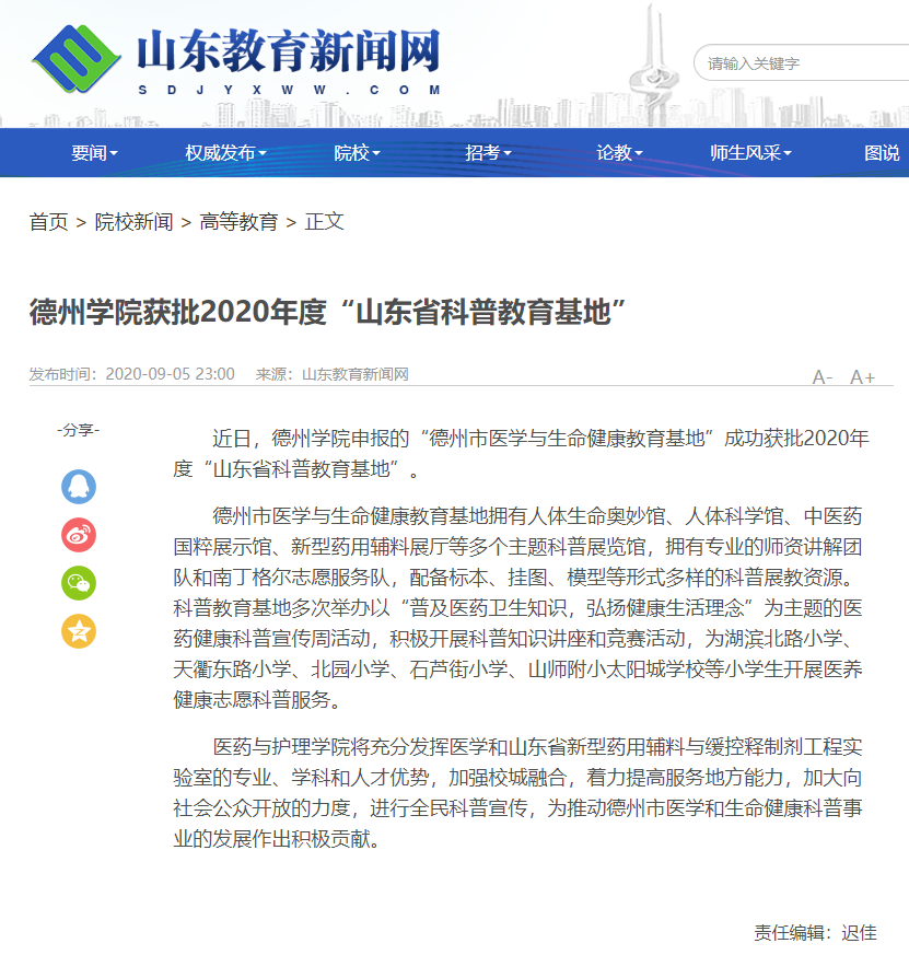 【德州新闻网】beat365官方网站获批2020年度“山东省科普教育基地”