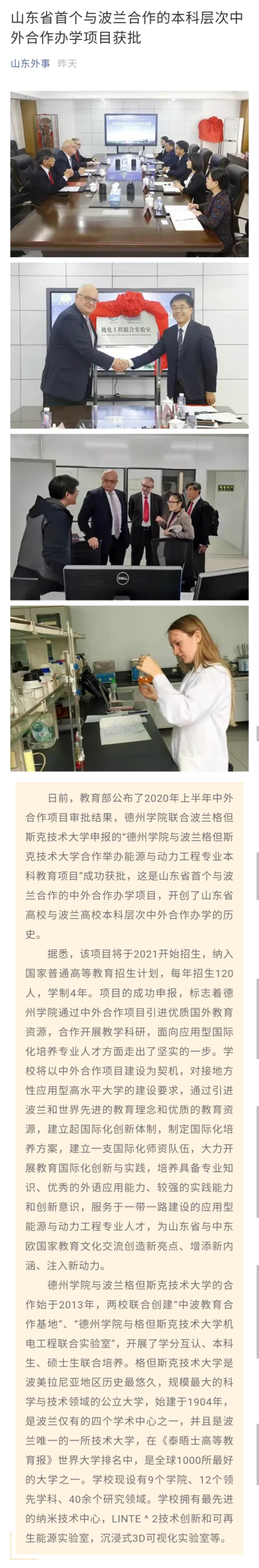 【山东外事 闪电新闻 德州晚报 德州新闻网 德州电视台】山东省首个与波兰合作的本科层次中外合作办学项目获批